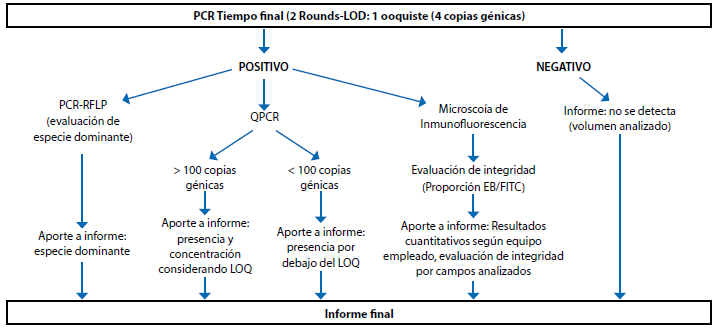Diagrama de flujo propuesto para laboratorios clínicos o ambientales para determinación de la presencia, concentración, especie e integridad de ooquistes de Cryptosporidium sp. No se incluye en la figura pero queda a consideración de los laboratorios clínicos o ambientales la inclusión de sistemas para la determinación de familias y subtipos de Cryptosporidium sp. LOD: Limit of Detection, LOQ: Limit of Quantification, EB: Evan’s Blue, FITC: Fluorescein-isothiocianato