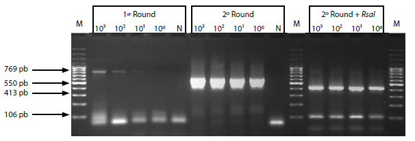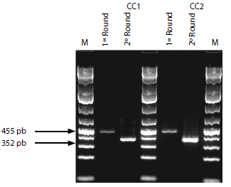 El perfil térmico de los primeros y segundos rounds consistió en una incubación inicial a 95 °C durante 5 minutos, 35 ciclos de 94 °C durante 1 minuto, 55 °C durante 1 minuto y 72 °C durante 1 minuto, seguidos por una extensión final a 72 °C durante 10 minutos con el posterior mantenimiento de las reacciones a 4 °C.