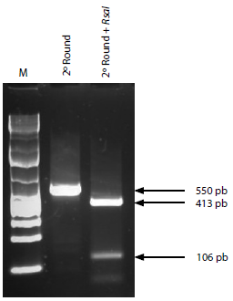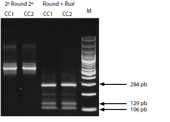 Para la determinación de especies de Cryptosporidium dominantes, los productos de PCR fueron digeridos a 37 °C con 10 Unidades de la enzima de restricción RsaI. Los productos de PCR y PCR-RFLP fueron resueltos por electroforesis en agarosa al 2% y teñidos con el compuesto Gel-Red. Los marcadores de peso molecular empleados fueron los marcadores M0623 o M1331 (Fermentas), de acuerdo a lo indicado en las Figuras 1, 2, 3 y ..