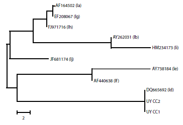 Relación taxonómica de familias del gen gp60 de las especies de Cryptosporidium hominis identificados en los casos clínicos analizados en este trabajo y aislamientos de referencia. La proximidad taxonómica entre los casos clínicos analizados y el locus DQ665692 correspondiente a la familia Id del aislamiento 4308 de Cryptosporidium hominis, ubica a los casos clínicos analizados como pertenecientes a dicha familia. UY CC1: Caso Clínico 1, UY CC2: Caso Clínico 2.