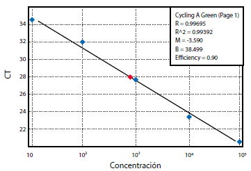 Evaluación (verificación) del comportamiento del sistema de PCR de tiempo real empleado en este trabajo. En azul se indican los CT correspondientes a 105, 104, 103, 102 y 101 copias génicas del standard del kit Genesig Cryptosporidium Oocyst Wall Protein (COWP) gene Kit (PrimerDesign Ltd) y Oasig qPCR Mastermix (PrimerDesign Ltd). En rojo se indica el CT correspondiente a la amplificación de 800 copias génicas iniciales de una preparación de ooquistes comerciales de Cryptosporidium parvum. El R2 de los resultados se indica en la parte superior derecha de la figura y es de 0.99392. La figura representa una de 3 réplicas en lo que respecta a las evaluaciones del sistema.
