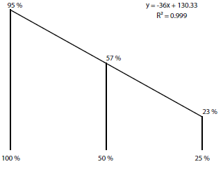 Evaluación por PCR de tiempo real de la robustez del sistema de recuperación de ooquistes de Cryptosporidium parvum de origen comercial por filtrado, retención y elución de membranas filtrantes. La figura muestra la tendencia lineal de la recuperación relativa de tres diluciones de ooquistes seriadas al medio. De los porcentajes esperados inicialmente (indicados en la base del gráfico) se indican sobre la curva del gráfico los porcentajes de recuperación obtenidos. Dichos porcentajes corresponden al promedio de 3 ensayos de siembra. El R2 de la curva obtenida se indica en la parte media superior del gráfico y es de 0.999.