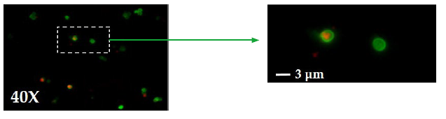 Inmunomarcación y detección por microscopía de fluorescencia de ooquistes comerciales de Cryptosporidium parvum sembrados en agua superficial (ambiental), recuperados por filtración y elución de membranas filtrantes. La imagen de la izquierda corresponde a una superposición de imágenes de los canales para los fluorocromos Evan's Blue (EB) y Fluorescein-isothiocianato (FITC) de uno de los campos fotografiados a 40 aumentos. La imagen de la derecha representa una magnificación digital de la zona delimitada por el rectángulo de líneas discontinuas en la imagen izquierda. En verde se aprecian los ooquistes de Cryptosporidium parvum. Si bien en esta figura se observa algo de material teñido por el colorante EB, no se observan ooquistes doblemente teñidos por EB y FITC.