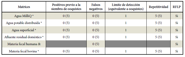 Performance de los sistemas de PCR de tiempo final anidad y PCR-RFLP para la detección del gen cowP1 de Cryptosporidium sp. Previo a las siembras de ooquistes en las matrices analizadas las reacciones de PCR anidado no detectaron la presencia del protozoario. Una vez sembradas no se observaron falsos negativos.