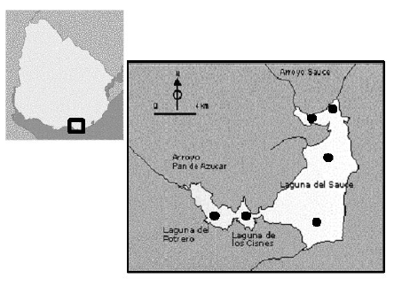 La Laguna del Sauce (34º43’S, 55º13’W) es un sistema eutrófico de gran tamaño (12 km largo máximo y 3,5 km de ancho promedio) ubicado en la costa del departamento de Maldonado en la región este de Uruguay (Figura 1).