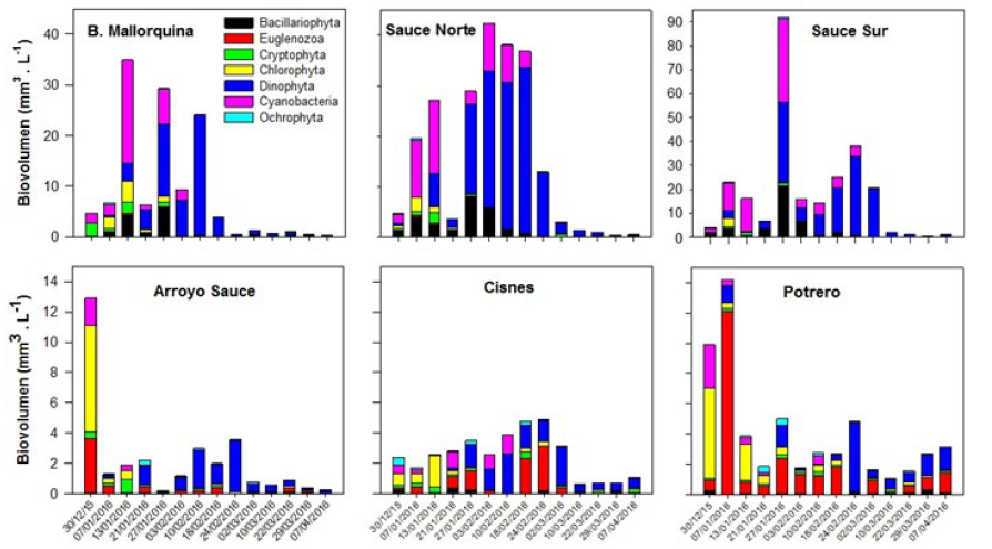 Se observó una gran variabilidad temporal y espacial en las abundancias de fitoplancton para los diferentes puntos de muestreo (Figura 2). Los eventos de altos biovolúmenes de fitoplancton fueron observados exclusivamente en los puntos de muestreo pertenecientes al sistema principal de Laguna del Sauce (Bahía Mallorquina, Sauce Norte, Sauce Sur) (Figura 2), que presentaron altos niveles de clorofila y ficocianina (Tabla 1). La composición de fitoplancton en el sistema principal estuvo dominada fundamentalmente por Dinophyta y cianobacterias, desde diciembre de 2015 hasta finales de febrero de 2016. En este período se registraron los mayores biovolúmenes de cianobacterias asociados a floraciones (Figuras 2 y 3). En los sistemas asociados (Arroyo Sauce, Cisnes y Potrero) la composición del fitoplancton fue más variada, con dominancia de grupos como Euglenozoa, Chlorophyta, Dinophyta a lo largo del periodo de muestreo (Figura 2).