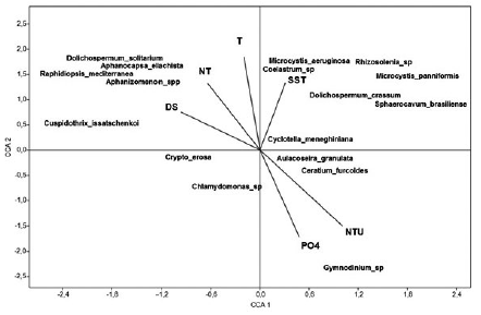 En cuanto a las variables ambientales asociadas a la composición fitoplanctónica, el análisis de correspondencia canónica (Figura 4) indicó que el ortofosfato (PO4), el nitrógeno total (NT), la penetración lumínica (DS), los sólidos en suspensión (SST), la turbiedad (NTU) y la temperatura del agua (T) fueron los principales factores que explicaron la variabilidad en la composición del fitoplancton, explicando el 61,2 % de la varianza total (λ1 = 20,4 y λ2 = 15,92) (significancia del modelo de F= 1,89 y p < 0,05; significancia de ejes: CCA1 : F = 4,26 y p < 0,01, CCA2 : F = 3,32 y p < 0,01). Dentro de las variables explicativas, el fosfato resultó más significativo (F = 3,13 y p < 0,05).