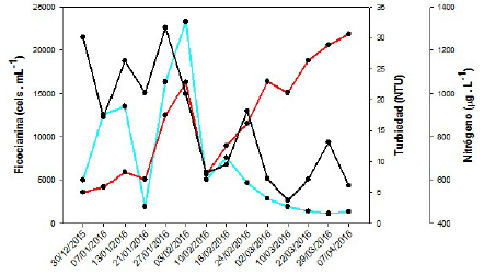 Variación temporal de la ficocianina (color celeste) en cels. mL-1, la turbiedad (color rojo) en NTU y el nitrógeno total (color negro) en μg.L-1 para cada una de las fechas de muestreo consideradas.