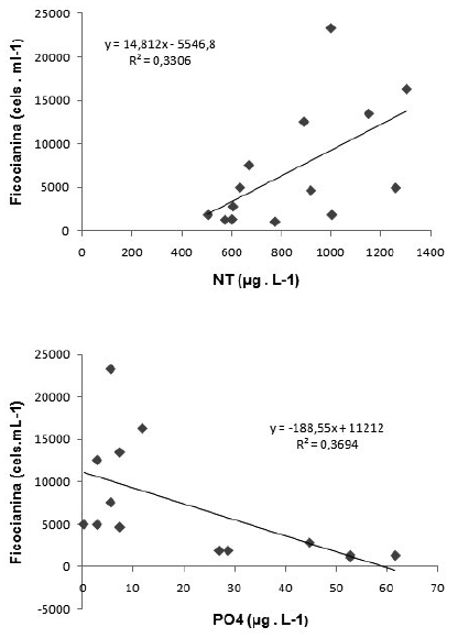 Considerando los nutrientes NT y PO4, la biomasa de cianobacterias (en términos de ficocianina) presentó una relación positiva respecto al NT (Figura 6A), y negativa respecto al PO4 (Figura 6B).