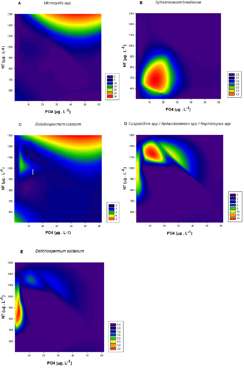 En cuanto a la significancia del PO4 y NT sobre la composición fitoplanctónica, las diferentes cianobacterias presentes en la laguna durante el periodo de muestreo presentaron patrones de biomasa diferenciales según las concentraciones de estos nutrientes (Figura 7). Los resultados indican que la ocurrencia de las especies de cianobacterias que alcanzaron las mayores biomasas (Dolichospermum crassum y Microcystis aeruginosa) ocurrieron a altos niveles de NT, en el caso de D.crassum en un rango algo mayor de PO4 en relación a M.aeruginosa, cuyas mayores biomasas se observaron a valores de PO4 mayores a 20μg.L-1(Figura 7A). Por otra parte, otras especies en menores biomasas presentaron respuestas complementarias a los niveles de los nutrientes mencionados (Figura 7C). El complejo Cuspidotthrix issatschenkoii, Aphanizomenon spp y Raphidiopsis spp presentó biomasas mayores a bajas concentraciones de PO4 y altas de NT (Figura 7D). En cuanto a Sphaerocavum brasiliense, presentó mayores biomasas a valores bajos tanto de PO4 como de NT (Figura 7B), mientras que Dolichospermum solitarium presentó mayores biomasas a valores muy bajos de PO4 e intermedios de NT (Figura 7E).