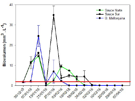 Variación del biovolumen de cianobacterias en el cuerpo de agua principal de la Laguna del Sauce para las fechas de muestreo consideradas. La línea horizontal roja representa el biovolumen correspondiente a un nivel de alerta 3, considerando agua bruta para potabilización.