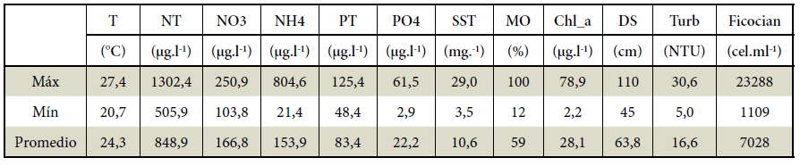 Principales parámetros fisicoquímicos para Laguna del Sauce en el periodo estival 2015-2016. Valores máximos, mínimos y promedio de: temperatura (T), nitrógeno total (NT), nitrato (NO3), amonio (NH4), fósforo total (PT), fosfato (PO4), sólidos totales en suspensión (SST), materia orgánica (MO), clorofila a (Chl_a), profundidad de disco de secchi (DS), turbiedad (Turb) y ficocianina (Ficocian).