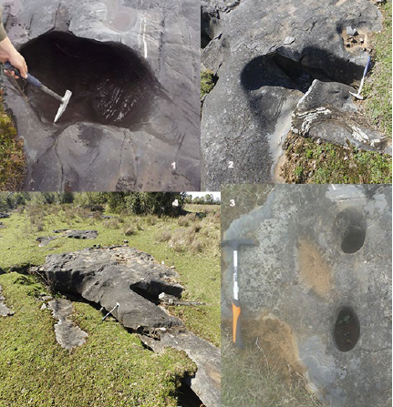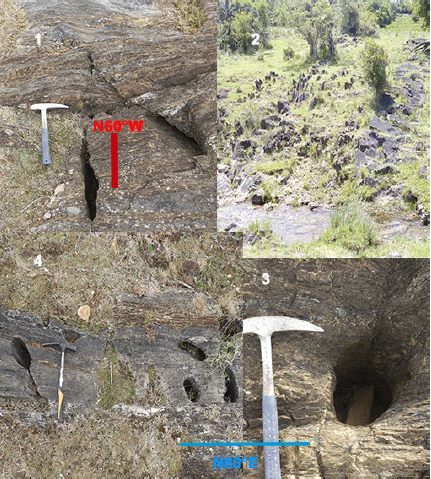 Esta forma kárstica superficial se genera por disolución de la roca calcárea y causa surcos paralelos y longitudinales que pueden interferir con las diaclasas y dar lugar a estructuras arborescentes. La ausencia de cobertura edáfica y una pendiente mayor a 10° favorecen la dinámica del sistema (Figura 15; foto 2). También se encuentran hoyos y nichos cilíndricos que se concentran en sectores donde se entrecruzan las estructuras N60°E y N60°W (Figura 15; fotos 1, 3 y 4).