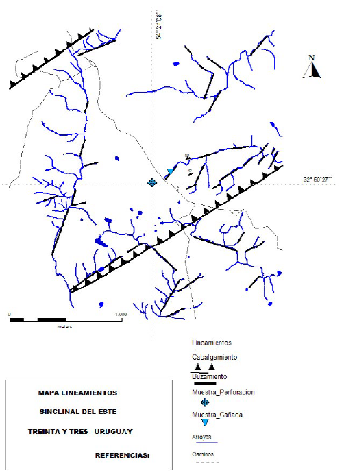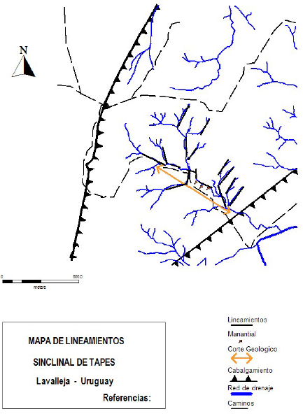 Mapa de lineamientos de la Región II (Sinclinal Tapes Grande), Lavalleja.