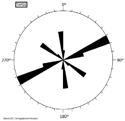 Rosa de rumbos de lineamientos para la Región II, Sinclinal de Tapes Grande, Lavalleja. La dirección N50°60°E es la de mayor presencia y coincide con la superficie So y se asocia probablemente a la cabalgadura que actúa al SE del área. El valor N 60° W corresponde a fallas transcurrentes que direccionan la red de drenaje. Los lineamientos N-S corresponden a la cabalgadura al NW del área.