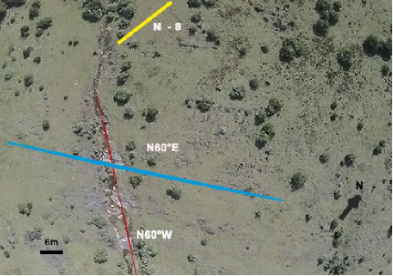 Imagen de drone donde se visualizan los lineamientos estrucutrales en superficie y se observan con claridad la estratificación N60º y la falla N60ºW. Las estructuras N-S se ven suaves sobre el extremo superior de la foto. Sinclinal Tapes Grande, Lavalleja (coordenadas del centro de la foto: X: 33º57'59'', Y: 54º57'36'', fecha: 19/9/15)