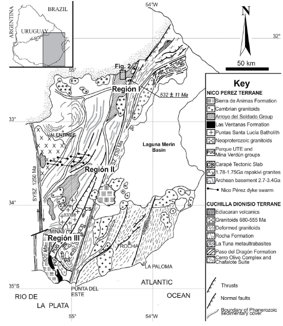 Bossi, J. y Gaucher, C., 2004. The Cuchilla Dionisio Terrane, Uruguay: an allochthonous block accreted in the Cambrian to SW-Gondwana. En: Gondwana Res, 7(3), pp.661-674.