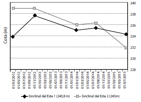 En todas las regiones el déficit hídrico registrado entre febrero y mayo de 2015 afectó la surgencia, impidiendo su registro en superficie. En las perforaciones en el Sinclinal del Este, el pozo de mayor caudal presentó mayor estabilidad frente a la variación de las condiciones climáticas. Considerando la diferencia de cota en el nivel estático de los pozos Sinclinal del Este se estima que existe independencia en el sistema kárstico del pozo 1 respecto al pozo 2.