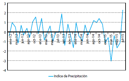 Gráfico de Índice de Precipitación Estandarizado para Treinta y Tres, entre 1/12 y 8/15. Valores mayores que cero indican que la precipitación fue superior al valor normal del lugar, valores menores a cero indican que la precipitación fue menor que el valor estándar.