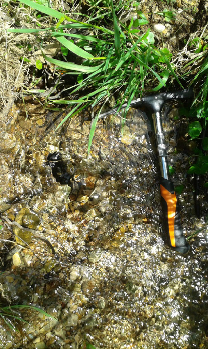 Se observó que existe relación entre la recarga de los pozos. En el periodo (diciembre 2012 – setiembre 2014) la recarga entre ambos sistemas se mantuvo en relación constante. Luego, la recarga disminuyó sensiblemente: entre febrero y mayo de 2015 hubo un descenso pluviométrico registrado en la región y se observó que el nivel de agua en el pozo 2 descendió con mayor pendiente que el pozo 1. Esto es coherente con la hidrodinámica de los sistemas kársticos: rápida respuesta inicial a la recarga y evolución condicionada por los circuitos de circulación en cada caso. En la región II se registró un sistema de manantiales que surgen a los lados de la red de drenaje en los niveles de ritmitas finas de calizas y dolomías. La red de drenaje responde a un sistema de fallas de dirección N60°W que se superpone a la estratificación N60°E y un tercer evento de dirección N-S afecta estas litologías. Entre la intersección de las estructuras N60°W y N60°E se generan estructuras propias del relieve kárstico como hoyos y nichos cilíndricos. En los niveles de interestratificación de calizas y dolomías se da la surgencia natural de aguas subterráneas (Figura 19). Para este sistema se midió el caudal de la surgente, arrojando un valor de 1200 l/h en setiembre de 2014 y en junio de 2015 estos niveles de agua subterránea no se manifestaron en superficie. El descenso del nivel de agua que se registró en boca de pozo en la Región del Sinclinal del Este también se observó, con menor precisión, en la Región del Sinclinal de Tapes con la ausencia de surgentes.