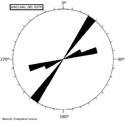 Rosa de rumbos de lineamientos para la Región I, Sinclinal del Este, Treinta y Tres. La dirección N 35° a 45° E corresponde al eje del sinclinal, estructura sobre la cual se desarrolla la perforación Sinclinal del Este 1 y a los cabalgamientos que se indican en la cartografía. La dirección N 60° a 70° E corresponde a fallas de menor presencia en el área.