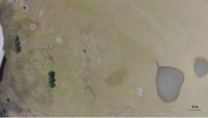 Cuerpos de agua temporales desarrollados sobre la Formación Yerbal, próximos al contacto con los carbonatos de la Formación Polanco en el Sinclinal del Este. Foto tomada desde el drone (coordenadas al centro de la foto: X: 32°50´36´´, Y: 54°24´10´´, fecha: 19/9/15).
