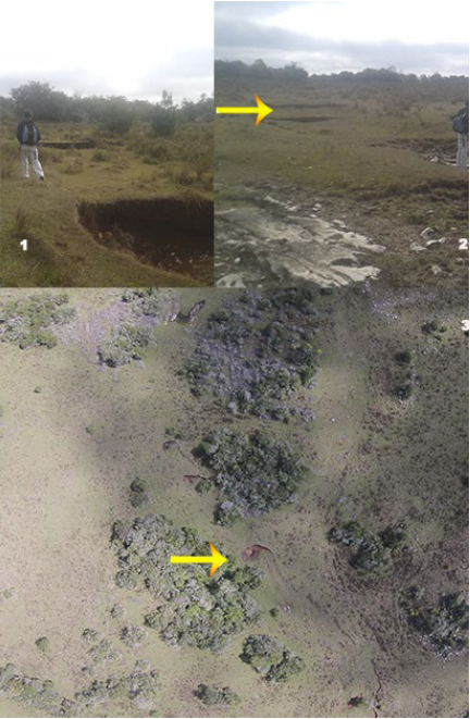 Distribución de estructura de depresión del terreno (Dolinas tipo «taza»), acompañan el rumbo N 45° E. Sinclinal del Este, Treinta y Tres. Dolinas tipo «taza» observadas en planta (1 y 2). Secuencia de Dolinas tipo «taza» observadas con imágenes drone (3) (coordenadas: X: 32°50´22´´, Y: 54°24´10´´, fecha: 19/9/15).