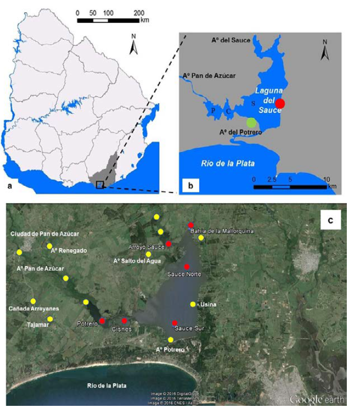 Sistema Laguna del Sauce. a) El Sistema Laguna del Sauce se ubica en el Departamento de Maldonado (sureste de Uruguay). b) El sistema se conforma de tres lagos someros conectados: Laguna del Sauce (S), Laguna De los Cisnes (C) y Laguna del Potrero (P). El círculo rojo indica la ubicación de la usina de OSE-UGD (Unidad de Gestión Desconcentrada) y el verde muestra la localización de la estación meteorológica del Instituto Uruguayo de Meteorología. Se muestran también los arroyos del Sauce y Pan de Azúcar (principales tributarios) y el arroyo del Potrero (conexión natural con el Río de la Plata). c) Mapa del Sistema Laguna del Sauce donde se indican los puntos de muestreo de las campañas semanales (puntos rojos) y los puntos que se adicionan en las campañas mensuales (puntos amarillos; ver subsección Muestreos semanales y mensuales de información limnológica en el cuerpo de agua y red de tributarios de la sección Materiales y Métodos).