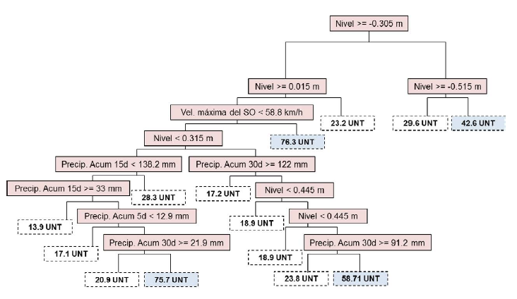 Árbol de regresión para predicción de eventos extremos de turbidez (rectángulos celestes) e identificación de condiciones meteorológicas e hidrológicas que los desencadenan (figura adaptada de Crisci, et al., en prensa).