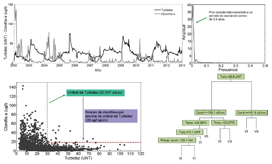 Resultados de análisis a partir de información diaria registrada en la planta de OSE-UGD. a) Series temporales de turbidez y clorofila-a en el período 2002-2012 donde se observa un patrón singular, con aumentos abpruptos de turbidez que desencadenana peróodos con elevados valores de esta variable y baja concentración de clorofila-a asociada. b) Espectro cruzado de series temporales de turbidez y clorofila-a de donde se concluye que estas dos variables tienen un período de oscilación comín de 2,5 años pero con un desfasaje de unos 1,2 años (los ciclos de turbidez ocurren primero). c) Diagrama de dispersión de turbidez vs. clorofila-a. Se identifica un umbral de esta última variable por sobre el cual la clorofila-a presenta valores bajos. d) Árbol de clasificación para predicción de Grupos Funcionales Basados en Morfología en función de variables de calidad de agua y meteorológicas. Las distintas figuras fueron adaptadas de Crisci, et al. (en prensa).