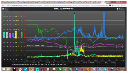 La Figura 4 presenta un ejemplo de salida gráfica de la sonda donde se observa la variación temporal de diversos parámetros de calidad de agua.