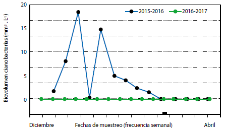 Variación temporal de la abundancia de cianobacterias (biovolumen de cianobacterias) en el subsistema Laguna del Sauce para los dos períodos considerados. En celeste: temporada diciembre 2015 – abril 2016; en verde: temporada diciembre 2016 – abril 2017.