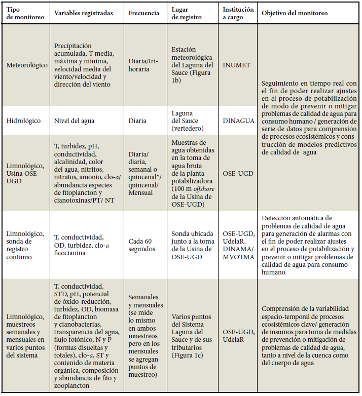 Tipos de monitoreos disponibles en el sistema Laguna del Sauce y principales características. * Refiere a que el monitoreo de abundancia de especies del fitoplancton y de concentración de cianotoxinas responde a una estrategia adaptativa donde se da un aumento en el registro de la información sis se detectan floraciones o especies potencialmente tóxicas. Abreviaciones: T: temperatura, PT y NT: fósforo y nitrógeno total, clo-a: clorofila a, OD: oxígeno disuelto, STD: sólidos totales disueltos, P: fósoforo, N: nitrógeno, St: sólidos totales.