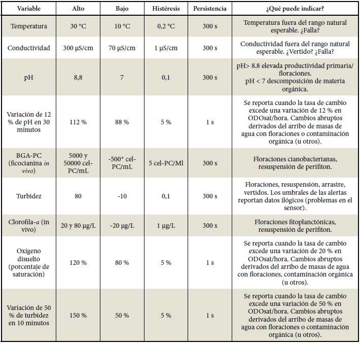 Sobre esta base, se definieron a priori y con participación de técnicos de todas las instituciones involucradas un conjunto de criterios para la generación de alarmas (Tabla 2). Los criterios fueron establecidos definiendo umbrales y tasas de cambio respecto al tiempo. Adicionalmente, se incluyeron alarmas de potencial mal-funcionamiento de los equipos (por ejemplo, valores no esperables de temperatura o turbidez). Para cada variable se establecieron valores de histéresis y persistencia para la generación de las alarmas. La histéresis establece el rango de la variación respecto al valor de consigna para el cual el sistema no genera alarmas. La persistencia, entendida como el tiempo de respuesta o retardo, establece el lapso en segundos por el que debe repetirse una consigna antes de la generación de la alarma. El ajuste de los parámetros de histéresis y persistencia fue realizado empíricamente para eliminar el envío de falsos positivos y el envío repetido de alarmas en lapsos cortos de tiempo (fenómeno frecuentemente nombrado como «traqueteo»). Las alarmas son ruteadas a usuarios predefinidos vía SMS, mail y/o las aplicaciones específicas.