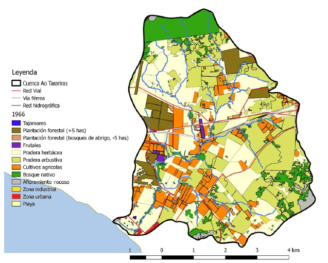 En base a las curvas de nivel y la red hidrográfica se determinaron los límites de la cuenca para el Arroyo Tarariras, abarcando un área total de 3.131 hectáreas (31,31 km.). Se lograron identificar todas las categorías de cobertura de suelo para casi la totalidad de la superficie de la microcuenca (97,7%). En general, tanto en 1966 como en 2013, la microcuenca presenta una cobertura rural de suelo predominante, caracterizado por praderas herbáceas y arbustivas. Estas praderas representan aproximadamente 2/3 del total de la superficie. En la fotointerpretación de las imágenes del año 1966 se observaron principalmente los ambientes de praderas arbustivas, herbáceas y bosques, que cubren 77,6 % del área (Figura 1). En cuanto a los resultados de la fotointerpretación de imágenes de 2013, las praderas arbustivas, las herbáceas y el bosque mantienen la predominancia, aunque aumentó el área de cobertura de zona urbana, forestal y tajamares, que representa un 11 % del área (Figura 2). Comparando estos resultados de fotointerpretación (1966-2013) se observa el área ocupada para cada categoría en cada serie y la variación existente; como mayores cambios se destacan los tajamares, los bosques de abrigo y la zona urbana (Tabla 2).