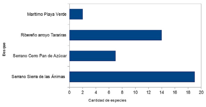 La composición del bosque serrano descripto en este trabajo es similar a la consignada por Brussa y Grela (2007) para estos ecosistemas. En el caso del bosque ribereño del arroyo Tarariras, solo el Ceibo, Erythrina crista-galli, especie más característica y abundante, coincide con la lista de Brussa y Grela (2007). Las especies registradas e identificadas en el bosque ribereño en la zona de la cuenca del arroyo Tarariras, no mencionadas en la bibliografía, fueron: Celtis iguanaea, Colletia paradoxa, Eugenia uniflora, Jodina rhombifolia, Lantana, Phytolacca dioica, Schinus engleri y Trixis praestans.