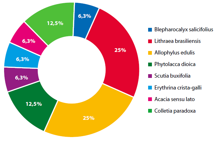 Las especies dominantes observadas en el total de los bosques muestreados de la cuenca fueron la aruera Lithraea brasiliensis y el chal-chal Allophylus edulis, con 25 % de dominancia de cada especie en el total de las transectas (Figura 4). La observación cualitativa más importante fue la fuerte presencia de la especie exótica Ligustrum sp. que domina el sotobosque del bosque serrano con individuos de distinta altura. En los cuadrantes de los puntos de muestreo en el bosque ribereño no se encontraron exóticas. En cambio, el bosque marítimo está compuesto por la especie exótica Acacia sensu lato. Se registraron las especies arbustivas Dodonaea viscosa, Lantana camara y Bacharis tridentata, dado que alcanzaron el diámetro mínimo de 7 cm.