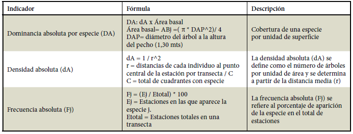 Para una primera caracterización de los bosques de la cuenca se aplicó un muestreo de la diversidad florística. Se realizó una estratificación primaria siguiendo criterios geográficos (Prodan, et al., 1997) y a partir de la fotointerpretación de 2013 se utilizaron las categorías propuestas por Brussa y Grela (2007): ribereño, serrano, marítimo o psamófilo. El muestreo se realizó por el Método de Cuadrantes Centrados de Morisita (1957) modificado por Mitchell (2007). En la Tabla 1 se presentan los indicadores y su fórmula de cálculo. Se trazaron transectas perpendiculares al curso de agua debido al gradiente de especies en función del nivel de humedad (Piaggio y Delfino, 2009), determinando una zonificación microclimática (Brussa y Grela, 2007). En los parches de más de 10 hectáreas, correspondientes únicamente al bosque serrano, los puntos de muestreo se ubicaron cada 100 metros. Se tomaron transectas en la parte alta, media y más baja con respecto a la altitud. En los demás parches y para todos los tipos de bosque, los puntos de muestreo sobre la transecta se ubicaron cada 20 metros. Un total de 50 sitios fueron muestreados en toda la cuenca, en los tres tipos de bosque y con variantes en el tamaño de parche. Se realizaron cuatro transectas en bosque serrano, tres en bosque ribereño y una en bosque marítimo. Dentro de cada cuadrante se relevó el individuo más cercano al punto central de muestreo, registrando la distancia a este (distancia r) y el diámetro a la altura del pecho (DAP) del árbol. Como el objetivo era relevar la vegetación arbórea, se registraron todos los individuos de DAP mayor a 7 cm.