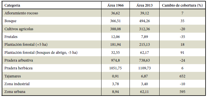 Análisis comparativo de áreas cubiertas por uso y ambiente para los dos años (1966-2013) en la Cuenca del arroyo Tarariras