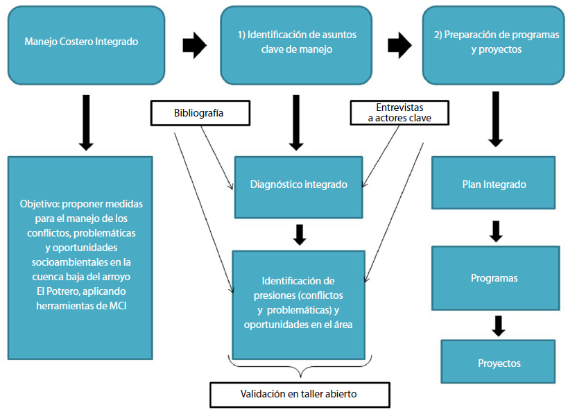 El objetivo de este trabajo es proponer medidas para el manejo de los conflictos, problemáticas y oportunidades socioambientales en la cuenca baja del arroyo El Potrero, aplicando herramientas de MCI. En este trabajo se muestran los resultados obtenidos en el desarrollo de las dos primeras etapas del ciclo de MCI: la identificación de los asuntos clave de manejo para la zona de estudio y la preparación de programas y proyectos que atiendan los principales conflictos socioambientales (Figura 1). Además, se reflexiona en torno al valor del proceso de MCI en sí mismo como promotor de transformaciones en temáticas socioambientales.