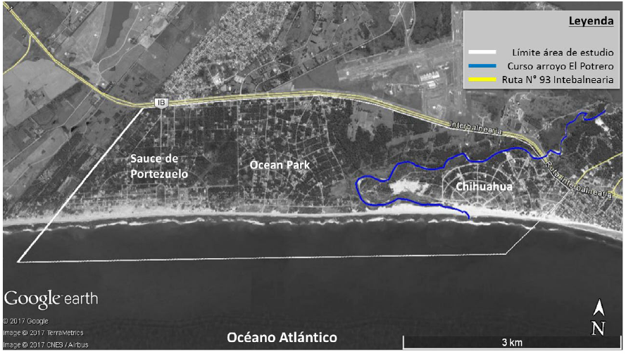 El área de estudio de este trabajo se encuentra circunscripta a la cuenca baja del arroyo El Potrero, ubicada al suroeste del departamento de Maldonado en Uruguay (34°52’31” S, 55°06’25” W) (Figura 2). Comprende los balnearios costeros Sauce de Portezuelo, Ocean Park y Chihuahua, así como los predios rurales y suburbanos linderos al curso del arroyo hacia el sur de la ruta Interbalnearia Nº93, contenidos en un arco de playa de 20 km de extensión delimitado por las puntas rocosas de Punta Rasa al oeste y Punta Ballena al este.