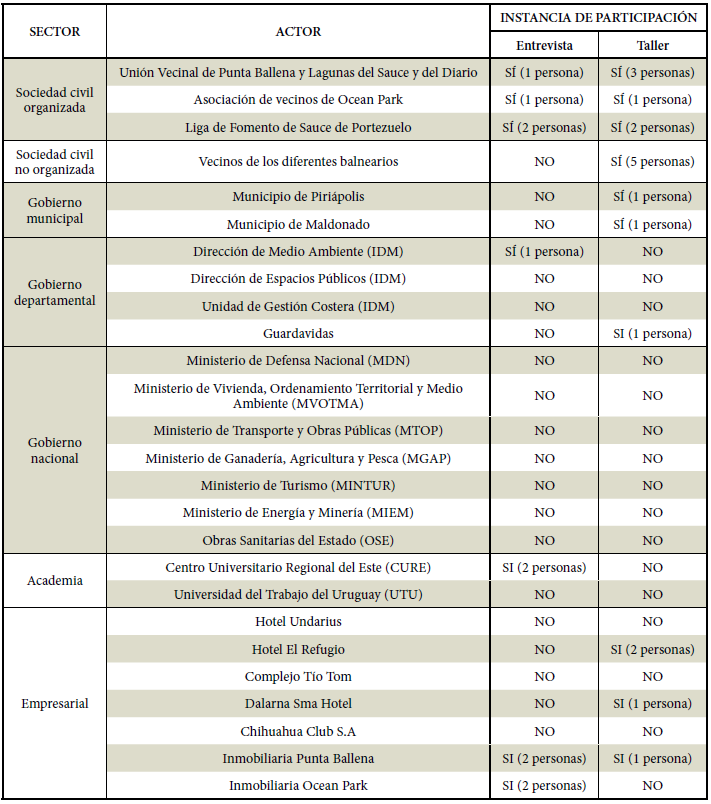 Los principales actores con injerencia directa en la zona de estudio se presentan en la Tabla 1. No fueron considerados en este trabajo los turistas, actores con presencia masiva pero esporádica en el área. La falta de comunicación e involucramiento de estos actores podría representar una limitante para el éxito de las propuestas de manejo. Tampoco se estableció una consulta directa a actores vinculados al gobierno nacional, aunque su perspectiva fue conocida en forma indirecta a partir de las decisiones adoptadas y del relato de los actores locales.