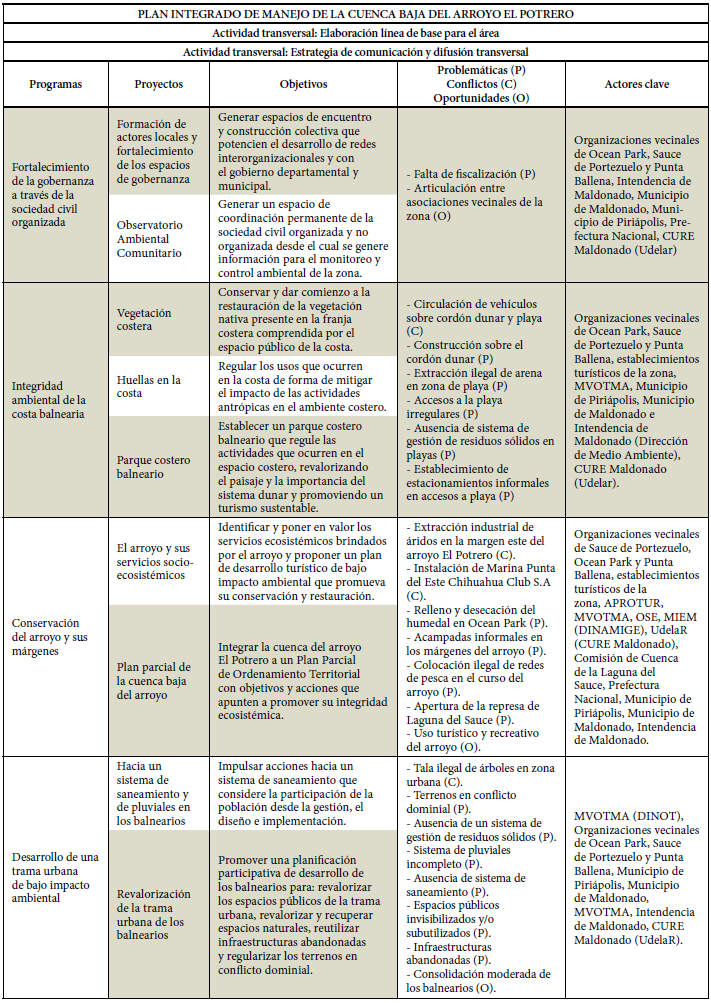 Se generó un «Plan integrado de manejo de la cuenca baja del arroyo El Potrero» (Tabla 2) incluyendo los programas y los proyectos. La estructuración en forma de plan permite reconocer las interacciones entre los asuntos, brindando una mirada holística. Como acciones transversales se identificaron la necesidad de contar con una estrategia de comunicación y difusión de las propuestas y de otras informaciones que sean de interés para la zona o sean generadas desde ella, y la elaboración de una línea de base del área de estudio que sustentará las propuestas posteriores y será la referencia para el monitoreo de las acciones.