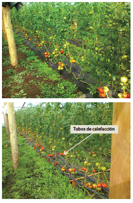 En uno de los invernáculos se incorporó un sistema de calefacción que utilizaba como fuente de energía el efluente termal y el otro se utilizó de referencia. López et al. (2000) explican que al aplicar calor en la base del cultivo se aumenta la temperatura del suelo y la del invernáculo aprovechando el movimiento convectivo del aire. El elemento conductor del calor en este caso es el aire, que proporciona un aumento rápido de la temperatura, debido a su baja inercia térmica, y se enfría de igual forma cuando deja de actuar el sistema de calefacción. Teniendo en cuenta este último aspecto, se diseñó el sistema de calefacción de 6 tubos de PE de 16 mm de diámetro por 21 m de longitud por cantero, que fueron dispuestos sobre el suelo en torno a las líneas de cultivo y a través de los cuales se hizo circular agua a temperaturas de entre 30 y 40 °C, proveniente de efluentes termales del hotel Posta del Daymán.
