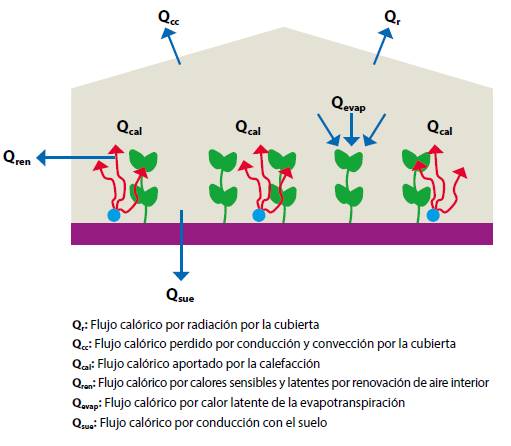 Flujos calóricos en un invernáculo (modificada de Varela, et al., 2008).