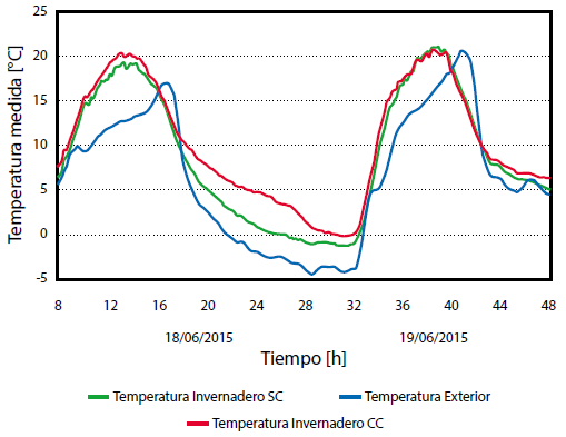 En cada invernáculo se instalaron estaciones meteorológicas automáticas (EMAs) modelo HOBO U30-NRC, de la firma Onset Computer Corp, con sensores de temperatura y humedad del aire a 0,5, 1,0 y 1,5 m, sobre un asta ubicada entre los canteros. Para el exterior se utilizaron los registros de temperatura y humedad del aire, velocidad del viento y radiación de una estación meteorológica automática con los sensores ubicados a 1,5 m de altura. Los registros se realizaron cada 10 minutos.