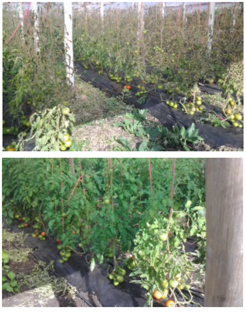 En el predio se construyeron dos invernáculos de 21 x 24 m, orientados en dirección E-O, con altura central de 4 m y lateral de 2 m. La estructura se conformó con madera de eucaliptus y cobertura de polietileno térmico de 150 μm. En el compartimento al este de cada invernáculo se sembró la variedad de tomate americano de ciclo largo Elpida.