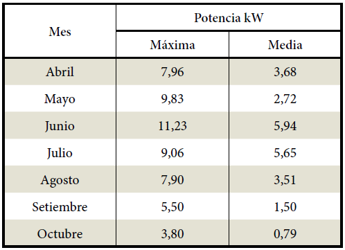 Potencias (máxima y media, kW) suministradas al ITCC para el periodo de abril a octubre de 2014.