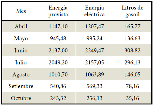 En la Tabla 2 se presenta la energía mensual aportada durante el mismo período, la energía eléctrica equivalente que proporcionaría un equipo de calefacción eléctrico con un rendimiento de 0,95 y los litros de combustible (gasoil) necesarios si se utiliza un quemador con rendimiento igual a 0,60.