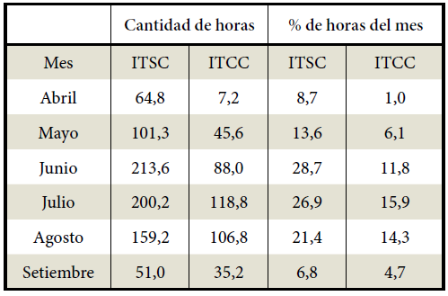 A continuación se presentan los resultados obtenidos en el balance energético calculado de abril a octubre de 2014, evaluado diariamente entre las 20 y las 8 hs. En la Tabla 1 se muestran los resultados obtenidos de potencia aportada al ITCC.